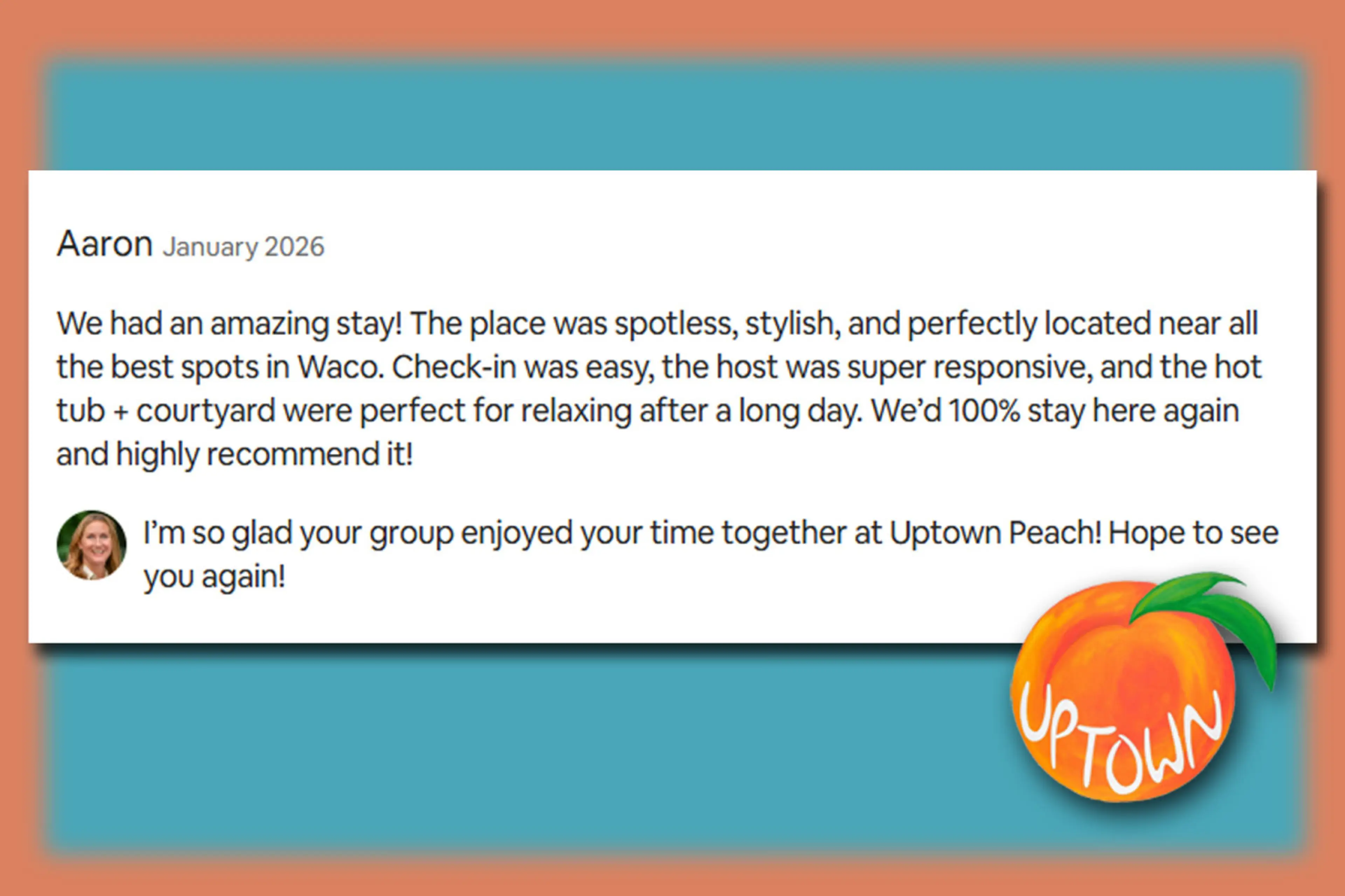 Welcome to Uptown Peach -- a playful, inviting home (sleeps 6) perfectly situated for touring Waco & Central Texas! **15% discount on stays 3+ nights ~ enter coupon code PEACHY3 at checkout** Inside the 2 bed/1 bath home you will find modern decor, 2 bedrooms with comfy beds (1 king and 1 queen), ...